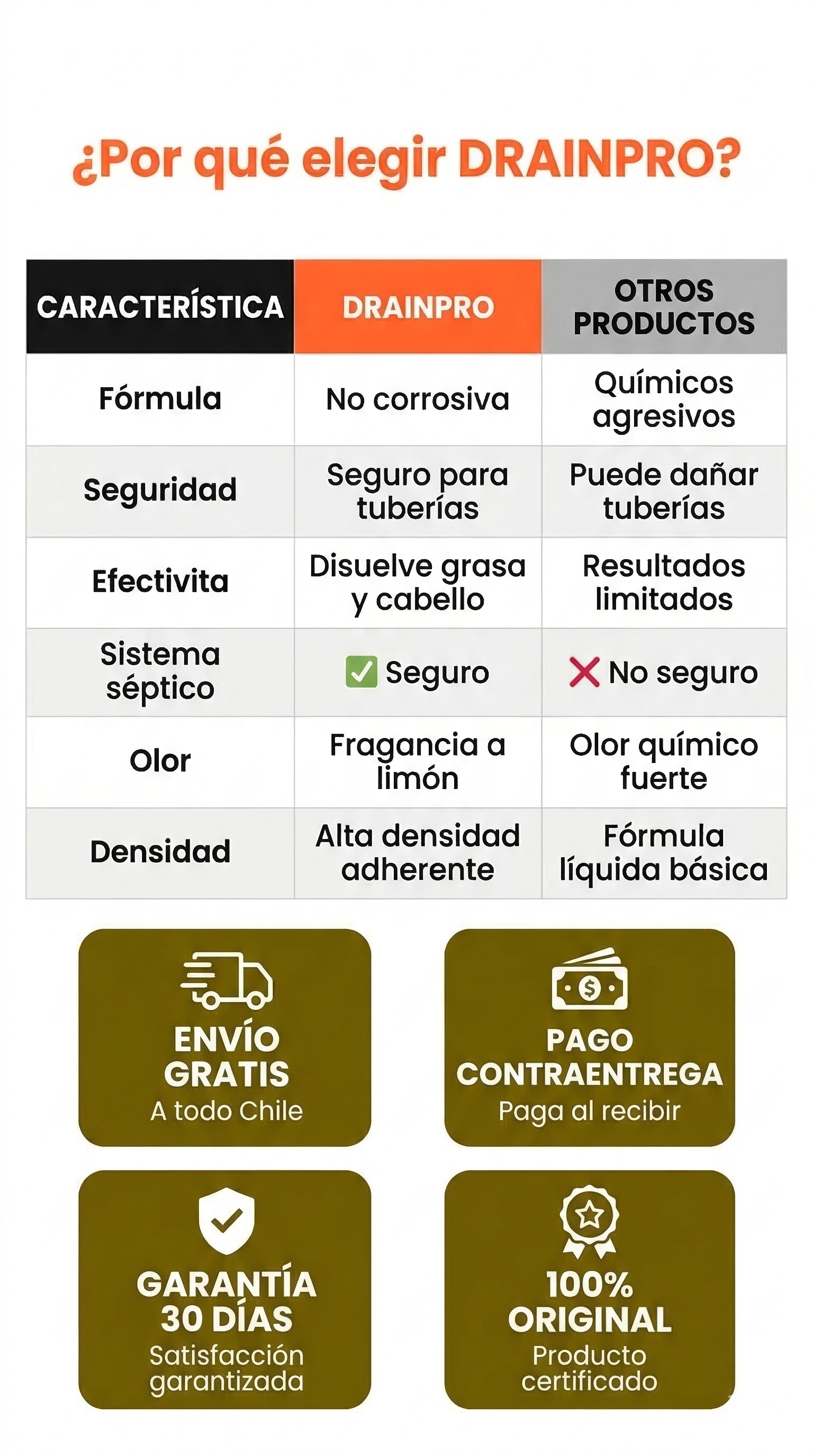 Sí, DRAINPRO tiene una fórmula no corrosiva que es 100% segura para tuberías de PVC, metal, cobre y sistemas sépticos. No daña tus instalaciones.