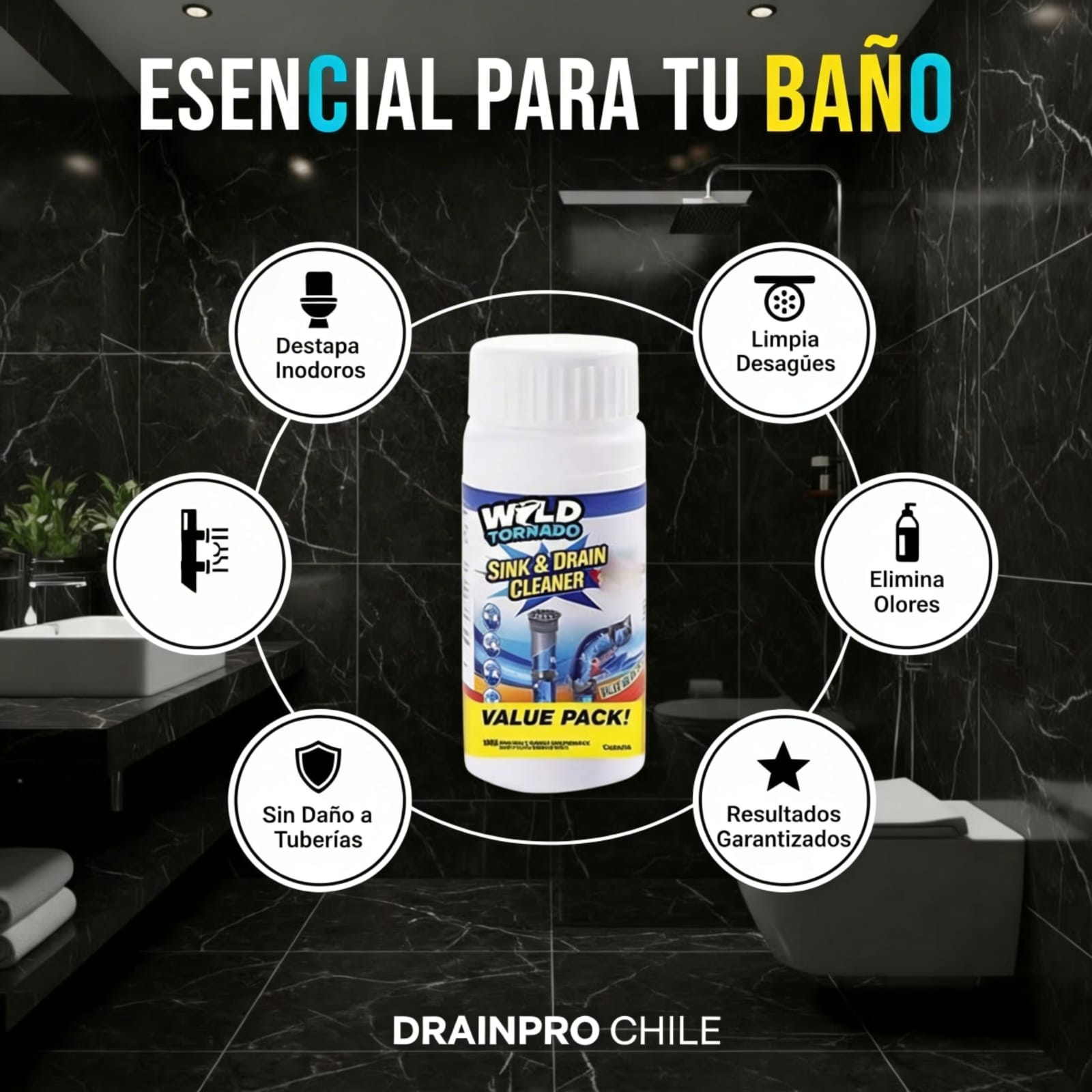 DRAINPRO disuelve eficazmente grasa, cabello, restos de jabón, papel y residuos orgánicos. Su fórmula de alta densidad penetra profundamente para eliminar las obstrucciones más difíciles.